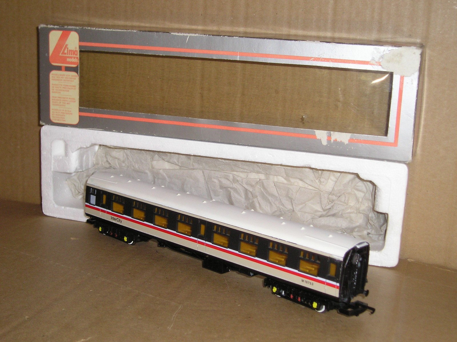BC1024 Lima 5326 Mk1 Inter-City 2nd class coach, excellent used boxed, roofs been repainted?. #M18753, one box lid is oversprayed on one side.