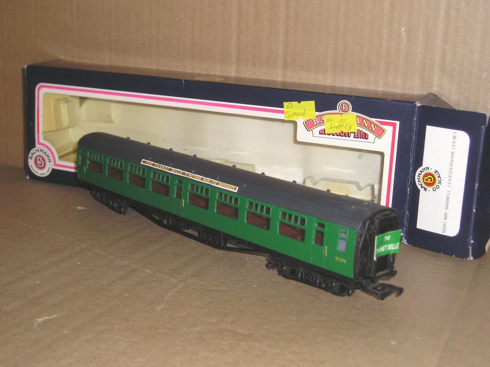 BC1077 Bachmann 34-525 63″ BR(SR) Bullied Corridor Second good/excellent used boxed. S127S (is correct – no suffix on box) with paper roof boards “The Thanet Belle Victoria Margate Ramsgate”