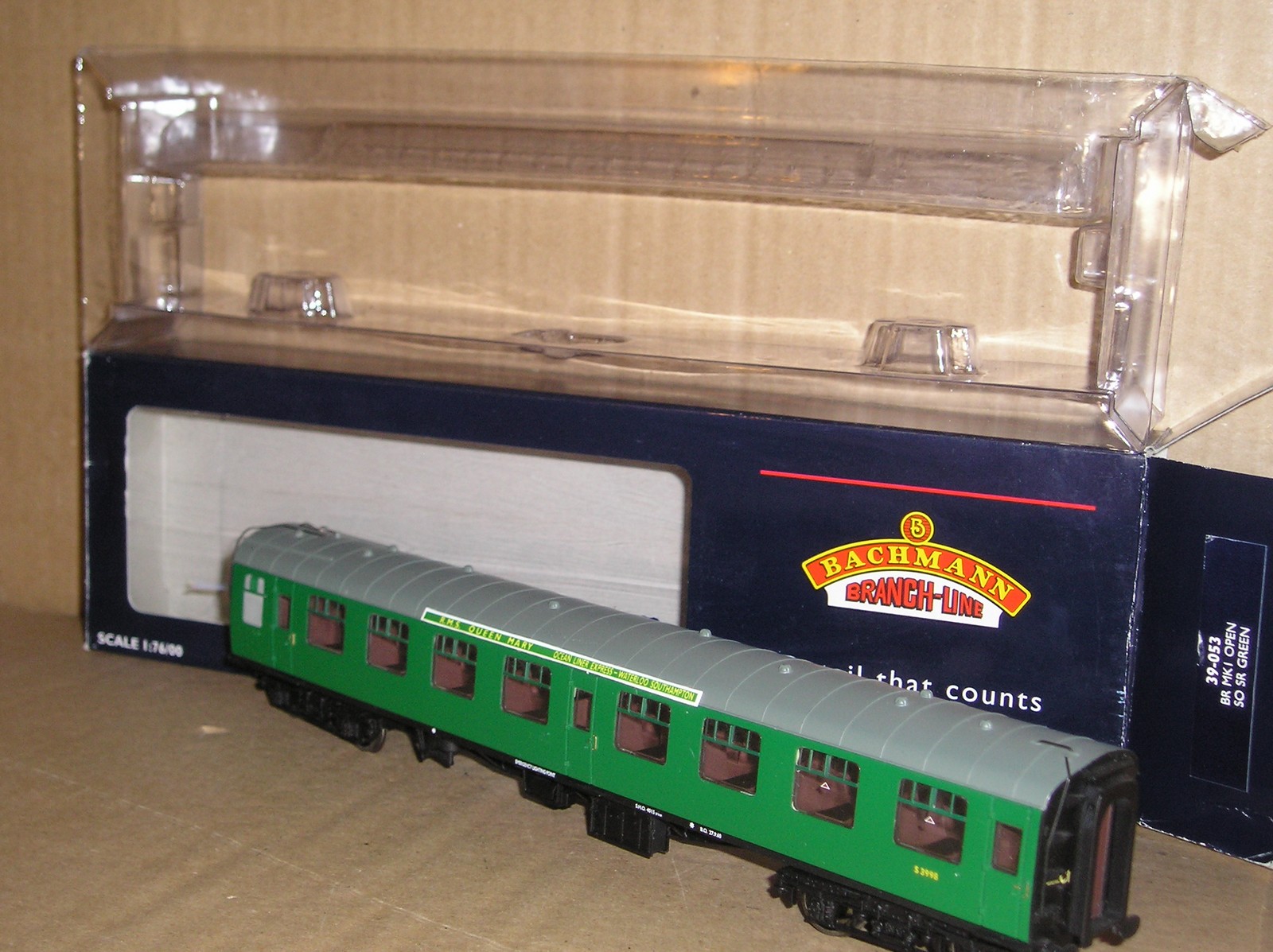 BC1082 Bachmann 39-053 BR Mk1 Second Open good/excellent used boxed. S3998 with paper roof boards “RMS Queen Mary Ocean Liner Express Waterloo Southampton”.