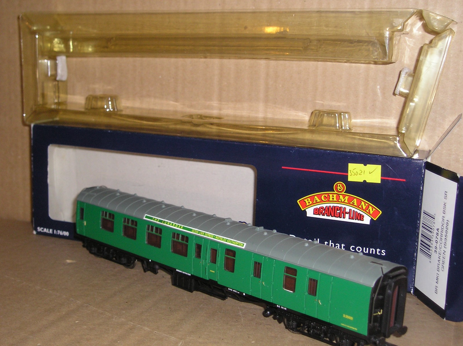 BC1083 Bachmann 39-078A BR Mk1 Brake Second Corridor good/excellent used boxed. S35021 with paper roof boards “The Cunarder Ocean Liner Express Waterloo Southampton”.