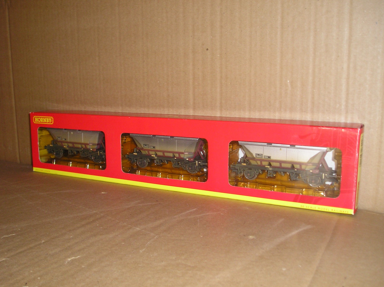 BW0383 Hornby R6224 HBA MGR Hopper wagons x3 weathered near mint/mint boxed.