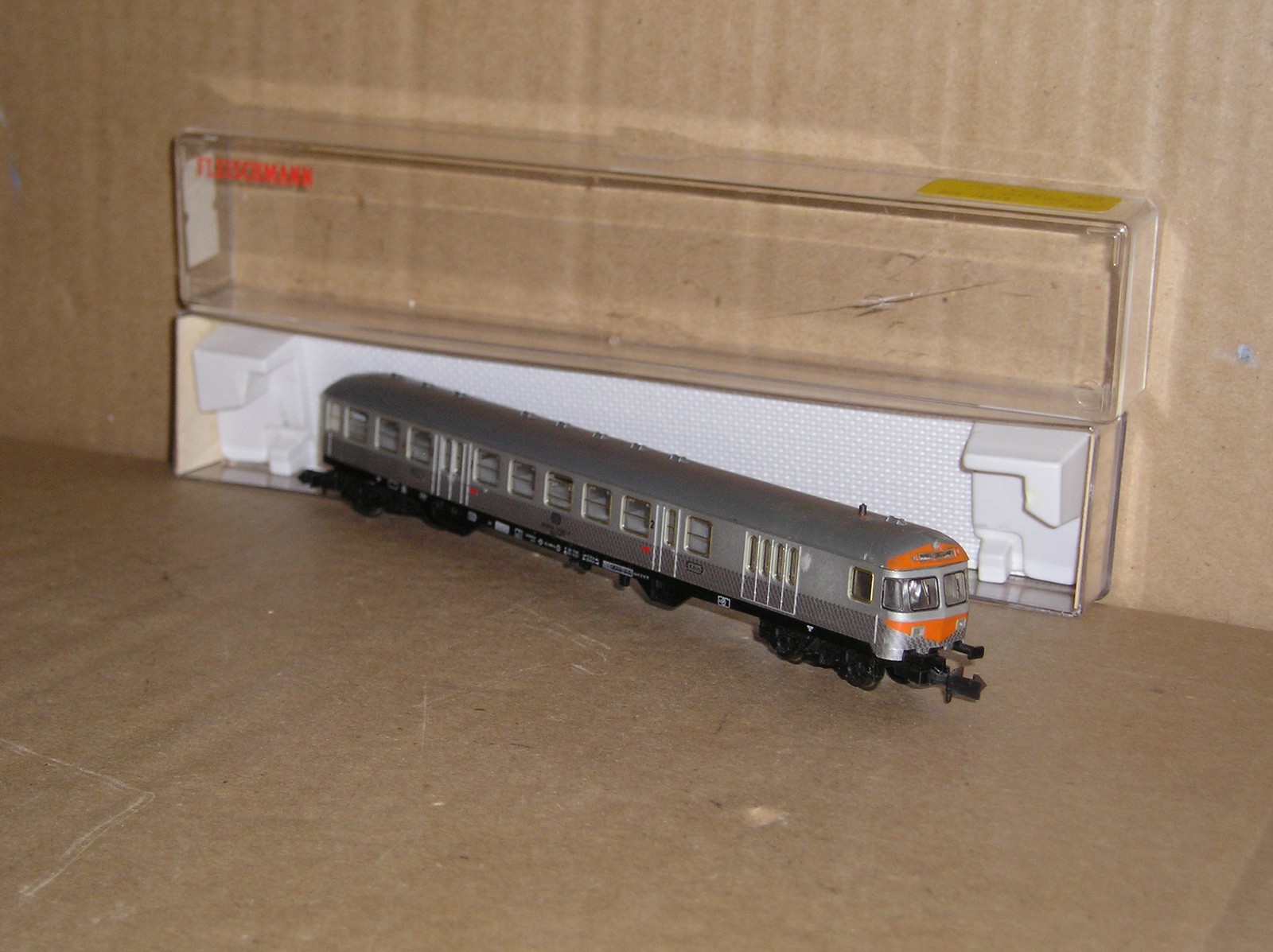 EC1124 “N” Fleischmann German DB Silverfish driving trailer, good used wrong box, age marks on the roofs will probably clean off. #50 80 82-34 047-4. Box lid may have a crack in it