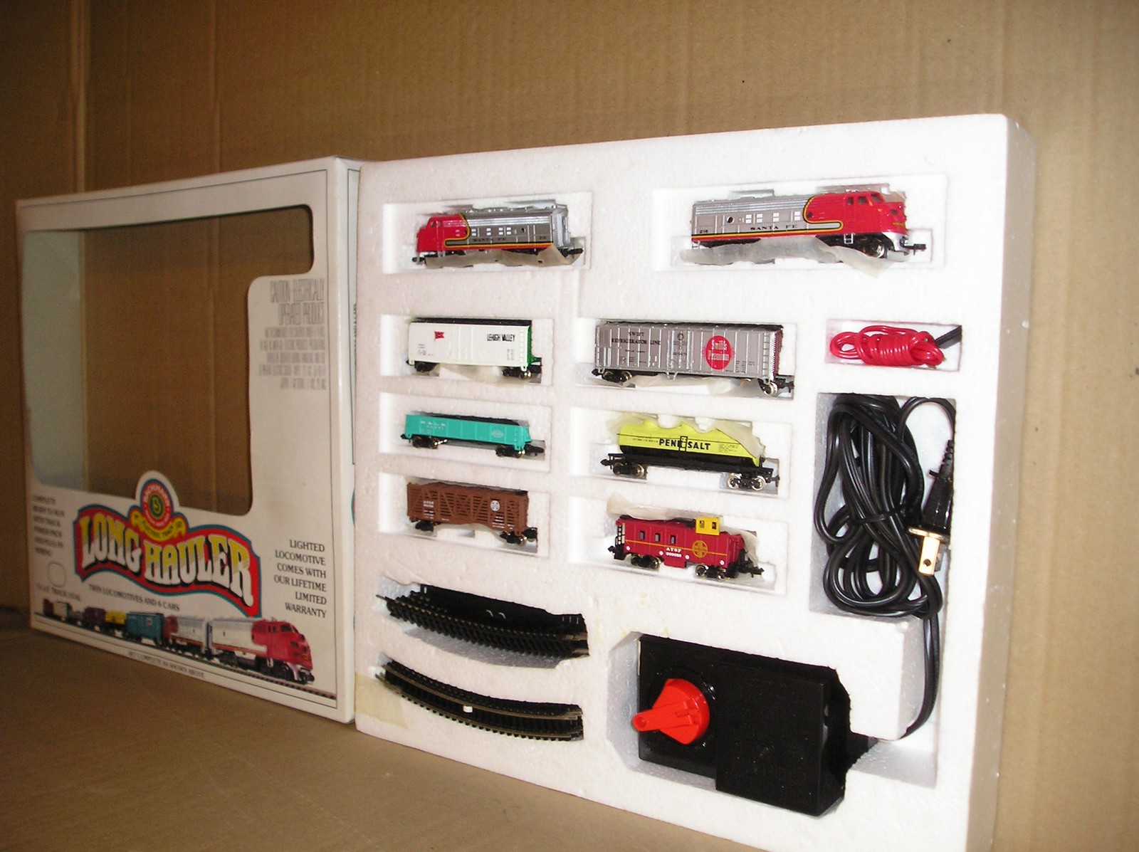 NAL0104s “N” Bachmann 24406 Long Hauler set of 2 loco’s, one powered and one dummy, both numbered 215, and 6 wagons and track, excellent used/unused? boxed. Loco is good/excellent runner for its age. There is also a power adapter/controller BUT it is 120V NOT 240V.
